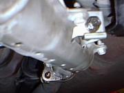 なお、普通はタービン遮蔽板の取り外しがあります。遮蔽板は上部(本体)と下部(フロントパイプに固定されている)に別れますが、本体の取り外しはボルト6個所で固定されており、手が入りにくい場所にあるので結構面倒でするまたボルトを外し終わってから抜く場合も、ブレーキマスターバックに当たらないように注意が必要です。そうそうレゾネーター関係も取っておいたほうが作業は楽です。